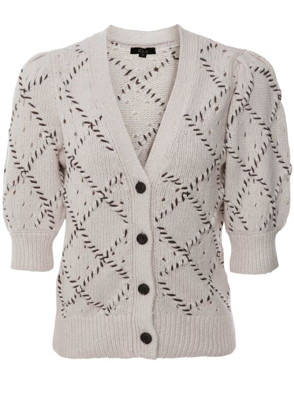 The Isla Openwork Cardigan from Rails is a cropped V-neck button-through knit, detailed with an open diamond eyelet stitch and contrast stitching through the pattern. Finished with ribbed trims and elbow-length puff sleeves, it layers easily over tees or shirts. Composed of a cotton-wool blend for structure and a soft hand, this cardigan fastens with a neat button placket and sits at the waist for a relaxed, feminine silhouette.