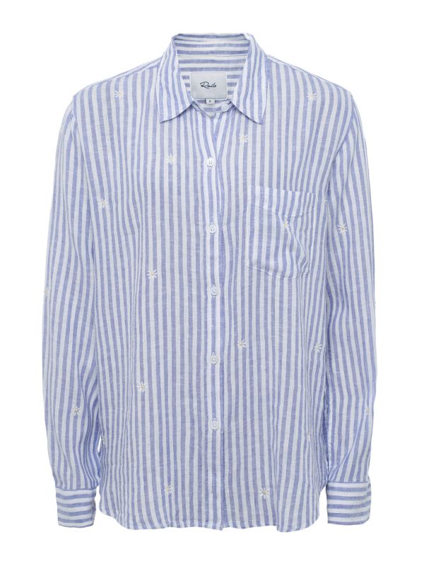 The Rails Charli shirt is ideal for casual days. Crafted in a linen and rayon blend, the shirt offers a lightweight handle and essential cooling qualities. Featuring a pointed collar, patch pocket and long sleeves, whilst the striped pattern and daisy embroidery exude fresh summertime vibes.