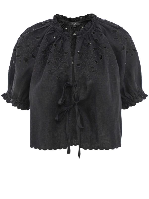 The Lizbeth Tie-Front Top by Rails is a cropped blouse with floral eyelet embroidery across the yoke and shoulders. A gathered, ruffled neckline meets short puff sleeves that finish with shirred elastic cuffs. The open front secures with twin ties and a scalloped hem trims the silhouette. Cut for a relaxed fit in lightweight linen, it pairs cleanly with high-waisted Pants or relaxed shorts for warm-weather dressing. Hand-finished detailing and breathable construction give the piece considered textural interest for seasonal ease.