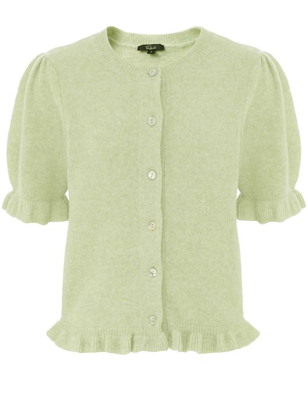 Lora Ruffle-Trim Cardigan by Rails is a softly knitted, button-through cardigan with a round neckline and a cropped silhouette. It features short puff sleeves finished with ruffle cuffs and a matching ruffle at the hem for a feminine touch. Tonal buttons fasten the front and subtle shoulder shaping gives structure to the relaxed fit. Ribbed trims and a softly brushed surface enhance the Cozy hand-feel. Wear it layered over dresses or with high-waisted Pants to add texture to transitional outfits.