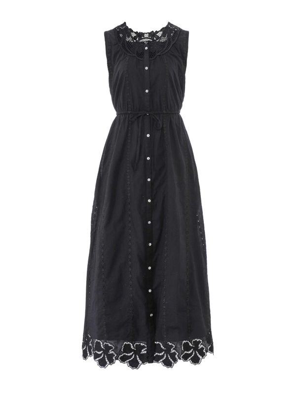 Rails Lorina Embroidered Maxi Dress is a sleeveless, button-through style with a slim drawstring at the waist for adjustable shaping. The design features an embroidered lace collar, vertical eyelet panels and a scalloped cutwork hem for delicate detailing. Fully lined in cotton for comfort, the flowing maxi silhouette finishes at the ankle for relaxed day-to-evening wear. Style with sandals or low heels, or layer with a cropped jacket for cooler evenings. The dress offers breathable construction and decorative trims that remain the focus.