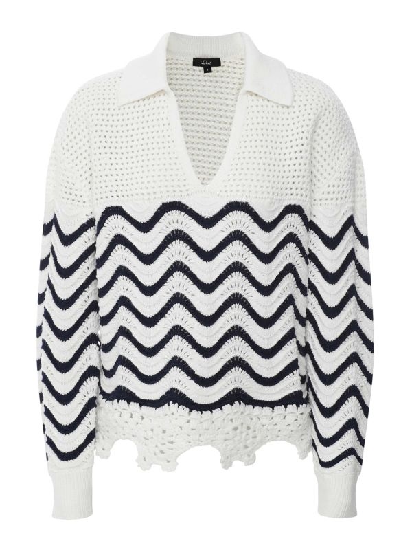 Contrasting wavy stripes bring a playful vibe to the design, and the eyelet details add texture and a touch of femininity. Finished with a scalloped hem for extra charm, this relaxed-fit Rails jumper pairs effortlessly with jeans or skirts for an easy, laid-back look.