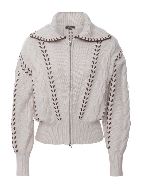 The Lune Zip Cardigan from Rails offers textured knit construction with prominent cable and open-stitch panels. Featuring a full-length zip and a wide ribbed collar, this cropped hem cardigan is shaped by a fitted, ribbed waistband that creates a soft blouson silhouette. Long sleeves mirror the cable motif and show contrast whipstitch detailing. Wear it zipped for a neat finish or open over a shirt for layered looks. The piece balances crafted knitwork with practical zip fastening for everyday wear.
