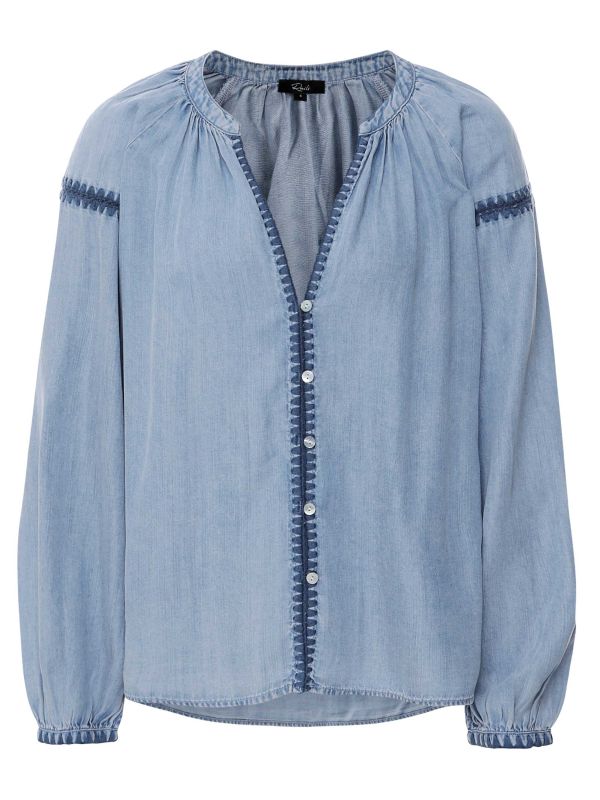 The Toshi Blouse by Rails is a lightweight button-through blouse cut from 100% lyocell (Tencel) and finished with delicate ribbon-edged trim. Gathered at the neckline, it opens to a flattering V-front and fastens with small buttons down the centre. Long, blouson sleeves are gathered into elasticated cuffs, while a yoke seam and decorative trim across the upper arm add subtle interest. Wear tucked into high-waisted jeans or left loose over trousers for an easy, put-together look. It suits both weekday and weekend wardrobes.