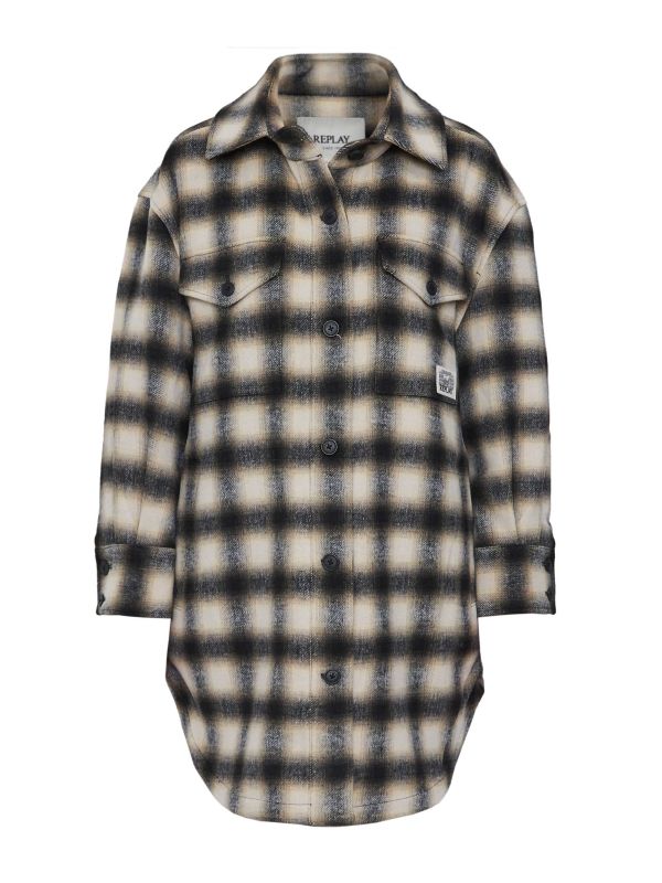 The Checked Longline Wool-Blend Jacket is a shirt-style coat from Replay. It features a button-through front, a classic shirt collar, chest flap pockets and long sleeves finished with button cuffs. Cut to a relaxed longline silhouette with a curved hem, it fastens with tonal buttons and carries a branded patch at the front. Made from a polyester-wool blend, the jacket offers structure while remaining easy to layer over knitwear or tailored pieces.