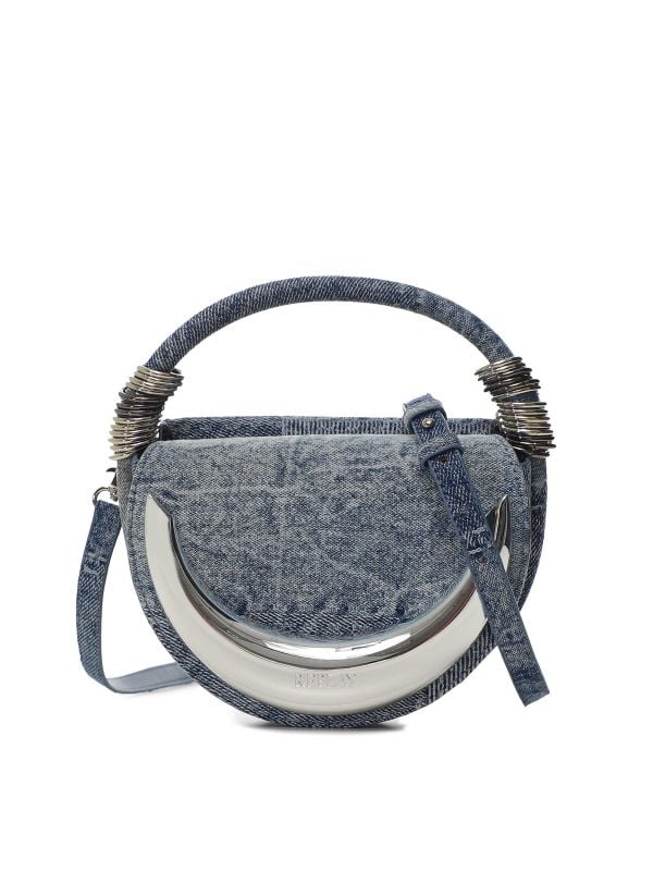 The Crescent Denim Top Handle Bag is a sculptural small bag from Replay. It features a crescent-shaped metal front trim stamped with the Replay logo and a compact rounded silhouette. The top handle is wrapped in denim and detailed with stacked metal ring hardware, while an adjustable, detachable strap converts the piece into a crossbody. A magnetic snap secures the flap and visible topstitching defines the form. Practical for carrying small essentials, this Replay bag blends distinctive hardware with a wearable, architectural shape.