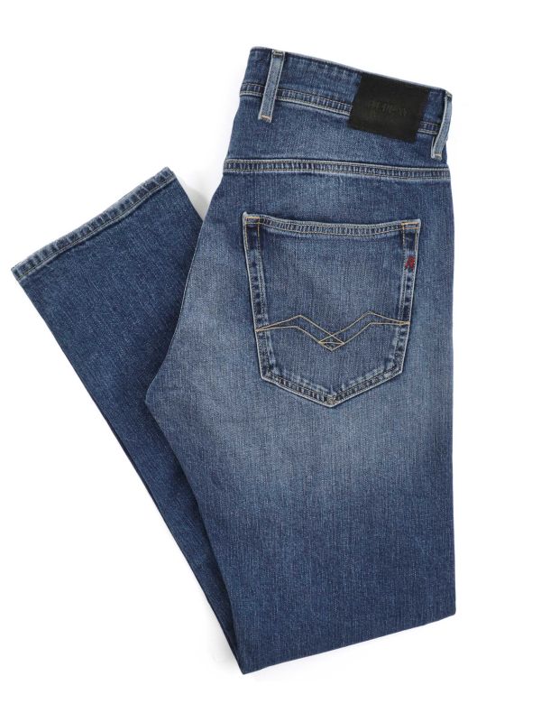 The Replay Grover Jeans are cut from cotton stretch denim for comfort and movement. They feature a five-pocket design with a coin pocket, belt loops, metal rivets and a branded leather waistband patch for authenticity. A faded finish with subtle whiskering lends a worn-in character while durable topstitching completes the look. Practical and wearable, these jeans pair easily with tees or shirts for versatile casual styling. Built for everyday wear, they offer durable construction and work well with knitwear or shirts.