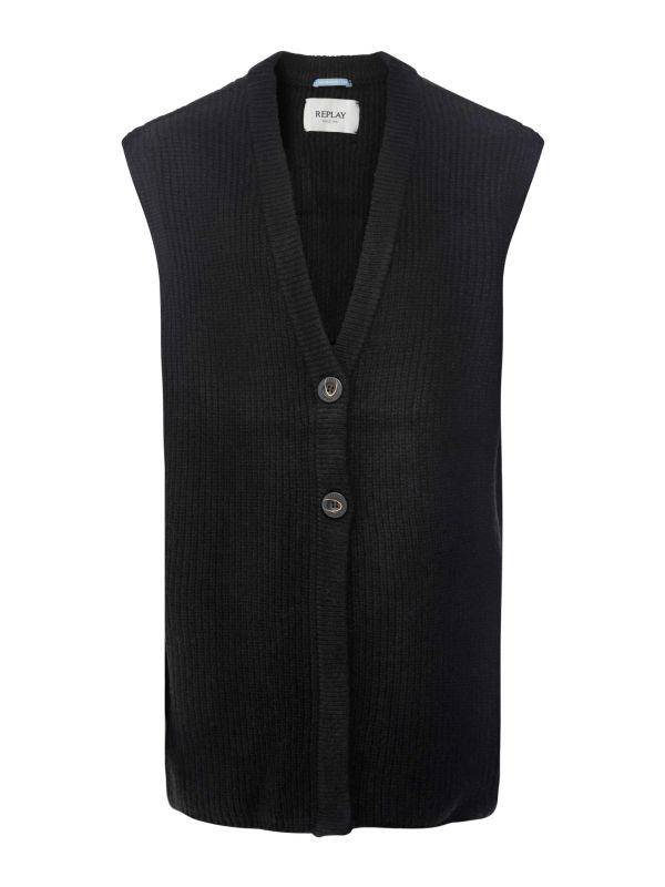 The Replay Sleeveless Cardigan is an oversized knit perfect for your woolly wardrobe. This cosy Reply cardigan is a sleeveless style crafted from a wool blend. It has a V neckline, two-button fastening and a rib-knit placket, complete with a Replay branded label on the back. Style yours alone, over a t-shirt or layer it over more knitwear for extra warmth.
