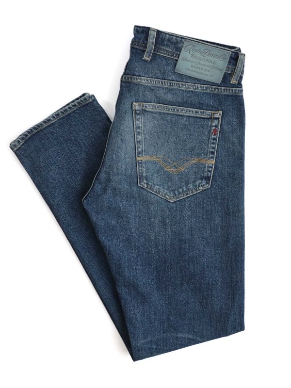 The Replay Slim Grover Jeans deliver a contemporary slim silhouette with authentic, lived-in character. They feature five-pocket construction, a coin pocket, visible copper rivets and a branded leather patch at the waistband. Subtle whiskering and a faded finish add texture and personality, while the cotton-elastane fabric provides comfortable stretch for daily wear. Cut for a slim fit through the thigh with a regular leg, they pair easily with tees or shirts for a smart-casual approach.