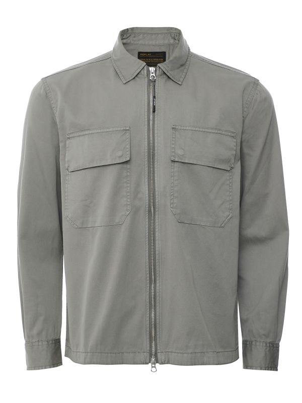 The Replay zip overshirt is crafted from durable cotton twill, providing a sturdy yet comfortable feel. This garment-dyed piece features a classic collar and a versatile two-way zip closure, allowing for easy wear and style adjustments.