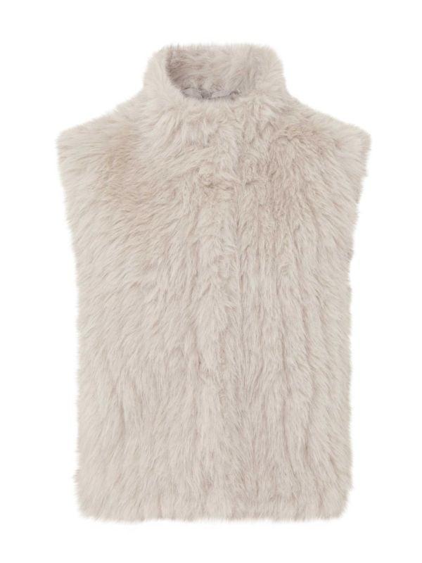 The Dava Faux Fur Gilet from Rino and Pelle is a sleeveless, cropped layer defined by a plush textured pile and vertical ribbed detailing on the front. It features a high stand collar and a discreet front fastening for a neat silhouette, with a smooth polyester lining for comfortable layering. Designed to be worn over knits or shirts, it offers warm layering without bulk.