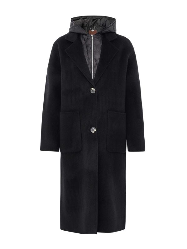 The Femia Premium Coat from Rino and Pelle is a longline winter coat with notched lapels and a clean, single-breasted front. It features visible patch pockets, two-button fastening and a zip-up quilted inner with hood for added warmth. The outer shell is 100% wool and the garment is finished with a straight hem and full-length sleeves. Practical and warm, it layers over knitwear and tailoring for winter.
