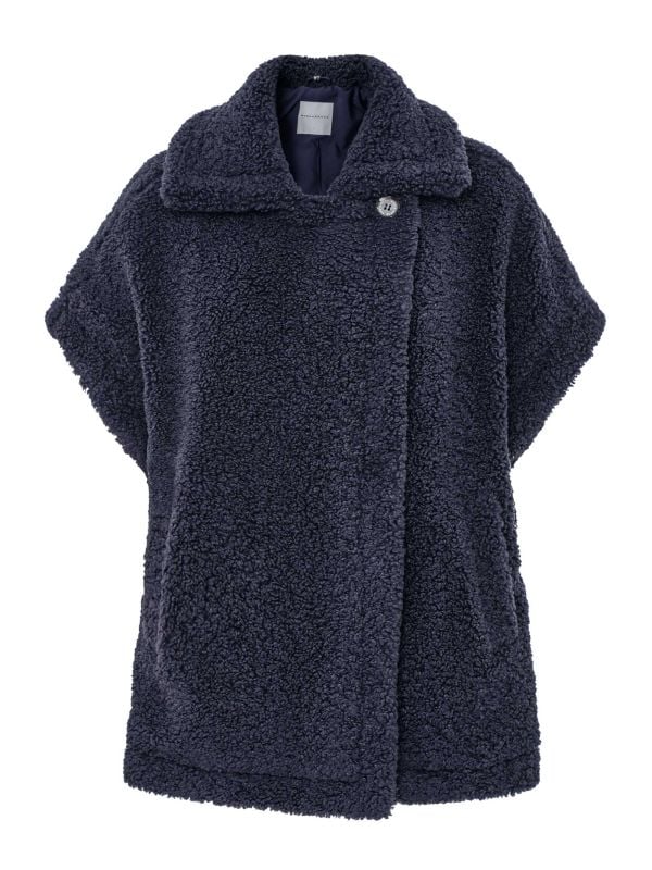 The Luca Teddy Cape from Rino and Pelle is crafted from 100% polyester with a 100% polyester lining for a soft, plush finish. The cape has a generous foldover collar, short cape sleeves, a concealed button fastening and a visible single button at the neckline. Practical front pockets are set into the relaxed silhouette for hand warmth and simple storage. Fully lined for structure, it sits to mid-thigh and layers easily over knitwear or shirts.