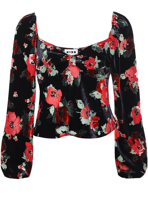 The RIXO Bridgette top is a vintage-inspired piece with an elegant look. Made from luxurious silk-blend velvet, it features a sweetheart neckline, blouson sleeves and a beautiful burnout poppy pattern. Wear this statement blouse to dress up jeans during the day and with a printed RIXO skirt on an evening.