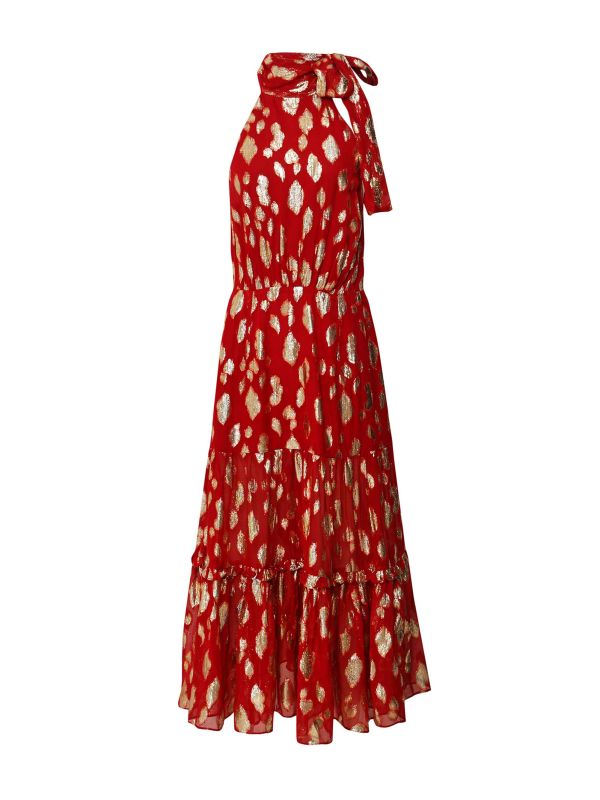 Shine bright this summer with the Eleanor midi dress from RIXO. Sporting lurex gold spots on opulent ochre red, featuring a halter-style bodice and floaty tiered midi skirt, this dazzling piece will turn heads. A chiffon necktie and slim keyhole opening with a rouleau button at the centre back complete this look.