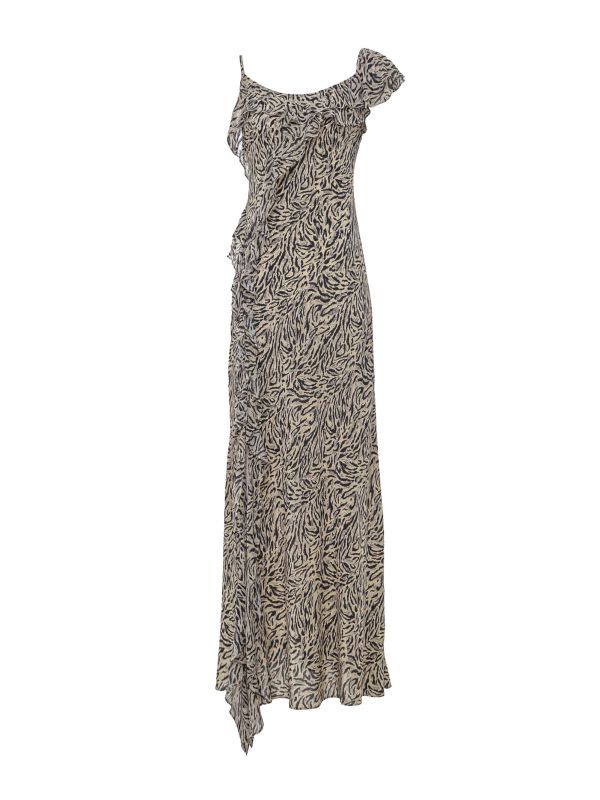 The RIXO Ester Silk Midi Dress is inspired by the iconic slip dresses of the 1990s. Cut from lightweight silk crepe de chine, this RIXO midi dress has an elegant drape and a pretty trail of ruffles down one side. It features an all-over animal print, an asymmetric neckline, a low open back and the brand's signature bias cut. It's the perfect piece for occasion dressing.