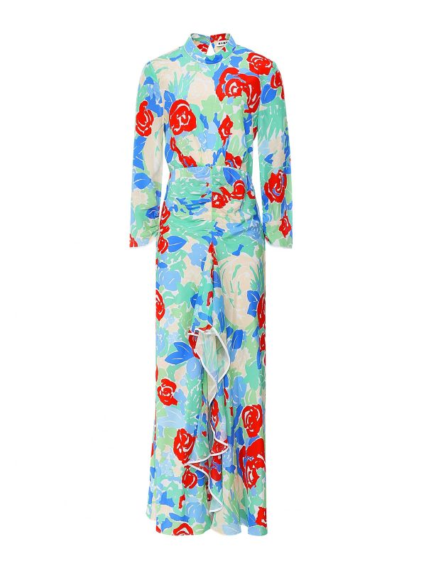 The RIXO Lucy dress is the perfect dress to stand out this Spring/Summer. Delicately yet expertly crafted from pure silk, the dress offers a lined and supportive bust. With an elegant high neckline, an open back and a ruffled centre split, the dress is complete with a hand painted print all over. Complement yours with stunning heels for the ultimate look.