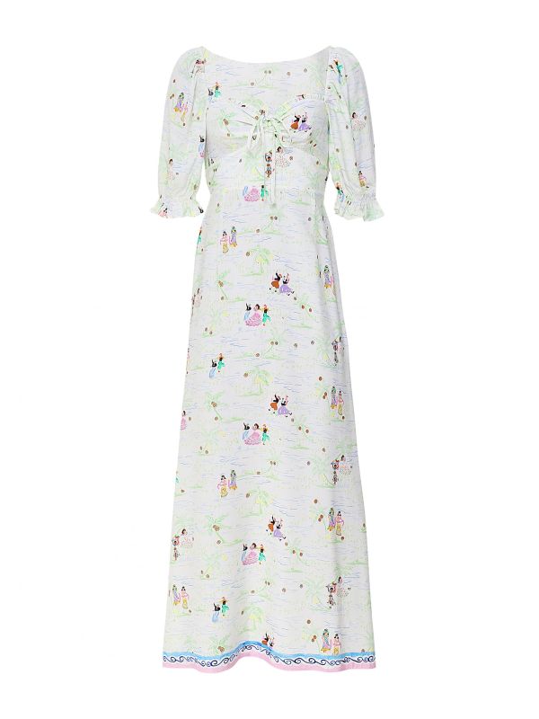 The RIXO Montenegro dress is a unique yet feminine must-have piece for SS22. Expertly crafted from pure viscose, the dress boasts short blouson sleeves and a sweetheart neckline. With ruching to the bust and a tie detail, the dress is complete with a dance print all over. Style yours with heels or sneakers depending on your occasion.