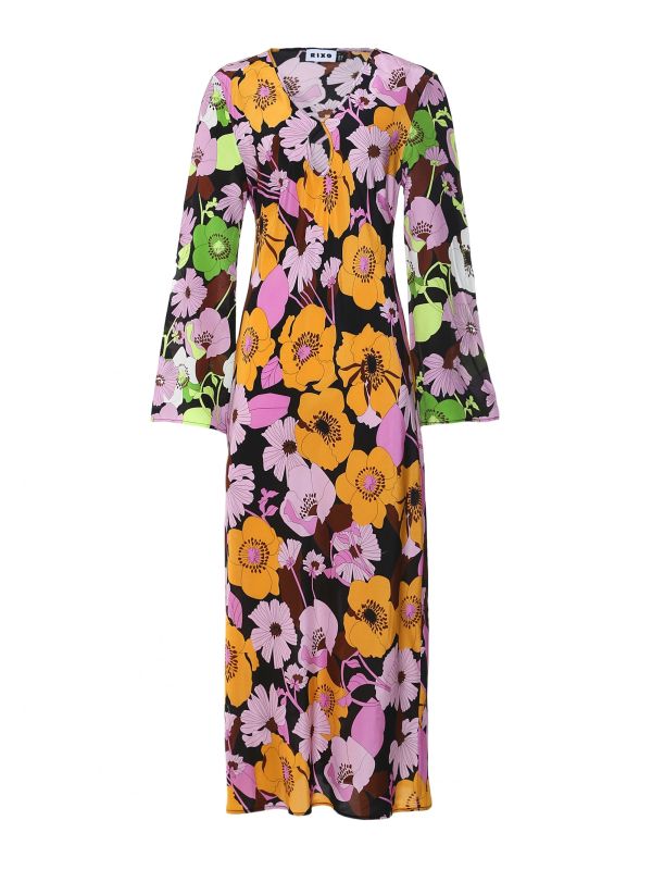 The RIXO Rae dress is back, crafted in silk and renewed with a retro look in the Abstract 60's Floral Swirl print. This gorgeous full length dress can easily be dressed up or down, teamed with sneakers and a shoulder bag during the day or with heels and statement earrings at a summer wedding. Rae features a flattering V-neckline with keyhole detail and is complete with subtly fluted sleeves for a vintage-inspired finish.