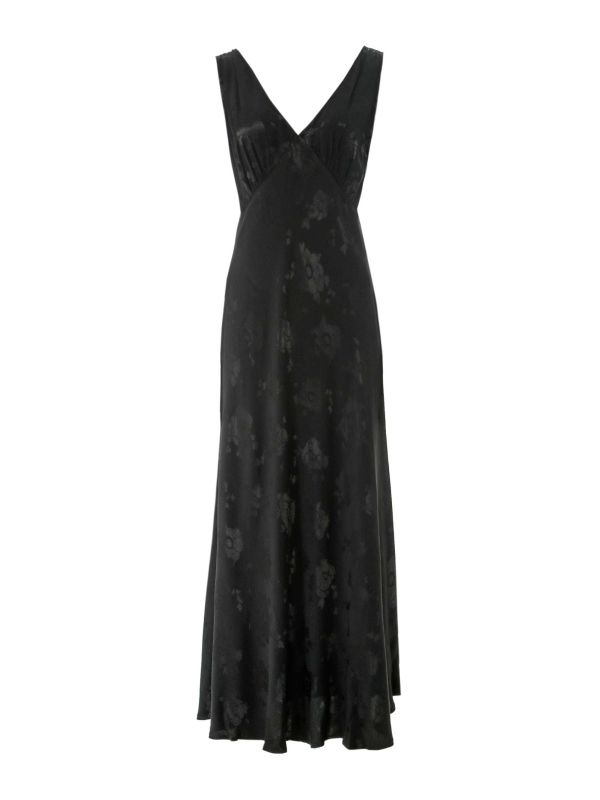 The dress features a daring deep V-neckline that adds a hint of allure, complemented by an open back for a touch of sensuality. Unlined for a lightweight feel, the midi-length design is adorned with a captivating jacquard floral pattern, adding a romantic and sophisticated charm to this enchanting piece.