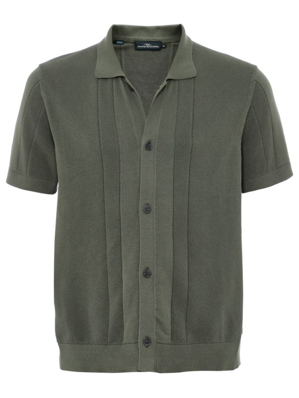 The Rodd and Gunn Cobb River Knit Shirt is a short-sleeve, button-through knitted shirt that blends contemporary tailoring with casual ease. Featuring a shirt collar, ribbed hem and cuffs, and vertical textured knit panels, it sits cleanly at the waist for a neat silhouette. The button-through front allows for versatile styling over a tee or worn closed for a smarter look. A small woven side tab and subtle tonal buttons complete the piece, making it suitable for refined weekend outfits and relaxed weekday dressing.