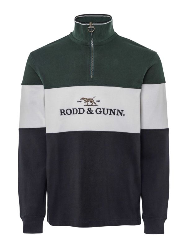 The Rodd and Gunn Foresters Peak sweatshirt brings a bold yet laid-back edge to your off-duty wardrobe. Crafted from soft cotton, the Rodd and Gunn sweat features a ribbed funnel neck with a quarter zip closure for easy layering and a touch of sporty style. The colour-block design and large embroidered logo across the front make a strong statement, while split sides, high-tension rib cuffs, and cover-stitched seams deliver comfort, durability, and a clean finish.