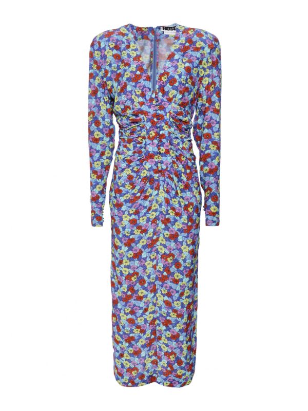 Get an elegant look this season with the ROTATE Heather dress. Made from a lightweight material with a vibrant floral print, this stylish dress features a versatile midi silhouette, long slim sleeves and shoulder pads for a voluminous look. The dress is complete with a flattering V-neck and gathered front with fabric covered buttons. Team with heels a clutch for a chic evening ensemble.