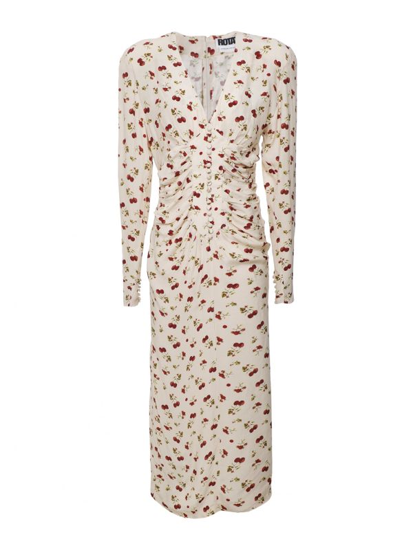 Get an refined look with the ROTATE Heather dress. Made from a lightweight material with a distinctive raspberry print, this stylish dress features a versatile midi silhouette, long slim sleeves and shoulder pads for a voluminous look. The dress is complete with a flattering V-neck and gathered front with fabric covered buttons. Team with heels a clutch for a chic evening ensemble.