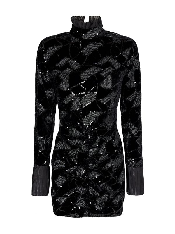 Get an elegant evening ensemble with the ROTATE Miki dress. This stunning mini dress has a flattering tight fit and boasts beautiful stand out details for a chic statement look. The collar and cuffs are elevated with pleats for a dose of distinctive style, while ruffle and sequin details add a glitzy finishing touch.