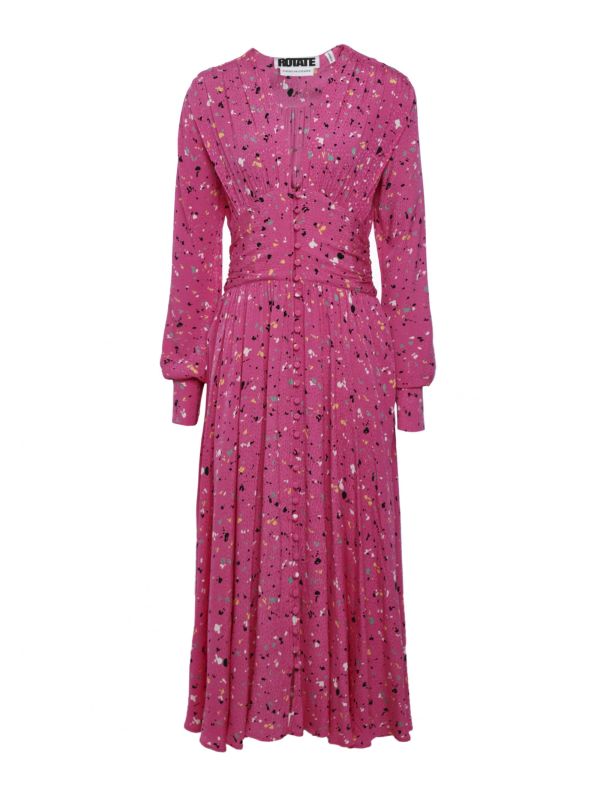 Get a cool, contemporary look this season with the ROTATE Tracy dress. Made from jacquard with gathered detailing for a fluid silhouette, this beautiful dress has a ruched waistband and falls to an elegant midi length. The dress is complete with a flattering V-neck, slim long sleeves and fabric covered buttons down the front, with a vibrant splatter print throughout.