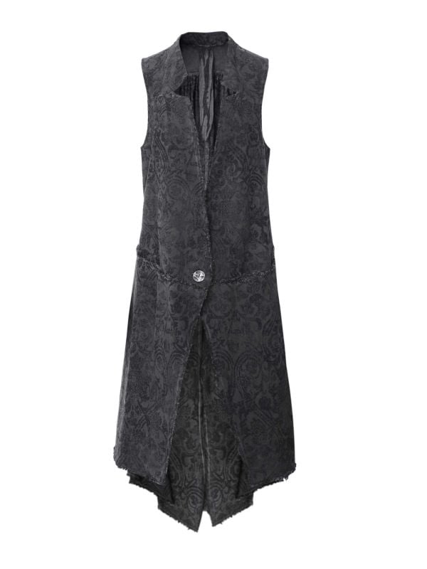 The S41 Print Waistcoat by Tuscany label Sanctamuerte has a unique design that will elevate your look. Made in Italy, this Sanctamuerte waistcoat combines two fabrics–cotton denim and smooth and silky rayon, both featuring a Baroque-style print. It has a deep V-neck, a single button closure and a self-tie belt at the waist. With its long length and asymmetric hem, it's great for wearing over trousers or a pair of shorts.