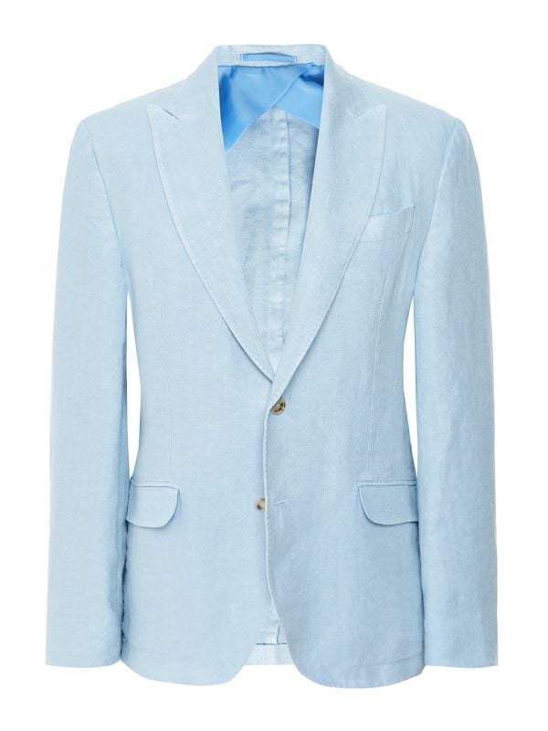 The Sand Sherman Easy Dandy blazer is crafted from a luxurious linen fabric with a garment-dyed herringbone pattern, offering a sophisticated and stylish look. The single-breasted design features a two-button closure and peak lapels, giving it a sharp, refined silhouette.