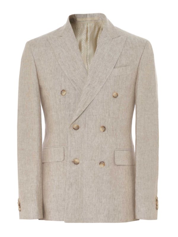 The Sand Star Double-Breasted Jacket updates formal tailoring with a structured double-breasted front, pronounced peak lapels and a six-button fastening. Cut with long sleeves, it has flap pockets and a neat welt chest pocket for a polished silhouette. Interior detailing includes a subtle geometric lined finish. Finishing touches include four-button cuffs and tonal buttons that complement the textured weave. Made in Portugal, this jacket blends considered construction with a versatile profile that pairs equally well with suiting or smart-casual separates.