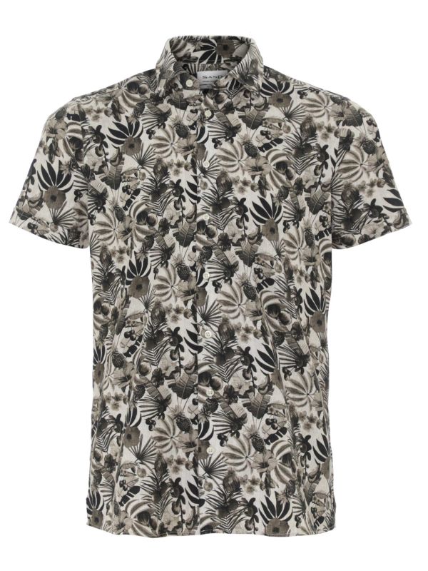 The Sand State Soft Patterned Shirt is a regular-fit shirt featuring an all-over floral print and a neat spread collar. It fastens with a button-through front and is designed for easy warm-weather wear thanks to breathable recycled cotton construction. Short sleeves keep the silhouette relaxed while the tailored shoulders and clean placket maintain a smart-casual edge. Layer over a tee or pair with chinos for versatile daytime styling; the piece balances patterned interest with a straightforward cut for approachable seasonal dressing.