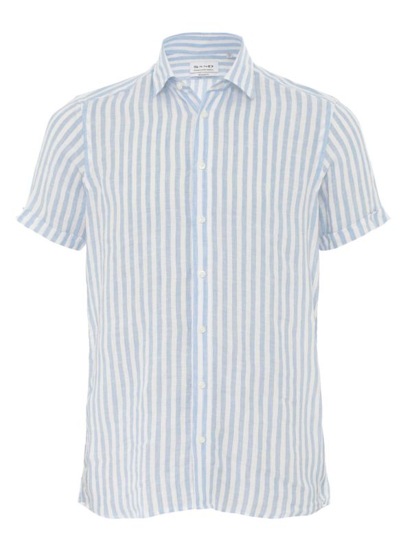 The Sand State Soft Short-Sleeve Shirt is a lightweight striped button-through shirt designed for warm-weather wear. Cut from Italian luxury fabric, it features a point collar, short sleeves with neat turn-up cuffs and a regular fit that sits comfortably through the body. Vertical stripes lend a clean directional look while the simple button front keeps styling minimal. Wear it untucked with chinos for relaxed days or layered over a tee for casual evenings.