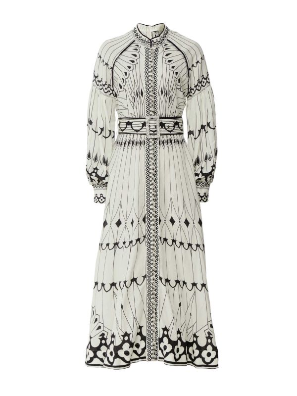Fall in love with the Pernilla Midi Dress from new brand to Jules B, Scarlett Poppies. This beautiful dress is an essential piece for your resort wear collection. Created from the brand's linen-viscose blend, the midi-length dress features a placement printed artwork throughout, with inspiration taken from the ceilings of St John's Cathedral in Edinburgh. It features a mandarin collar with contrast piping, an open placket, embroidered fabric buttons, a fitted waist, detachable buckled belt with eyelet details and long billowy sleeves with smock details. With its romantic feel, the Pernilla dress is an excellent choice for all spring/summer occasions.