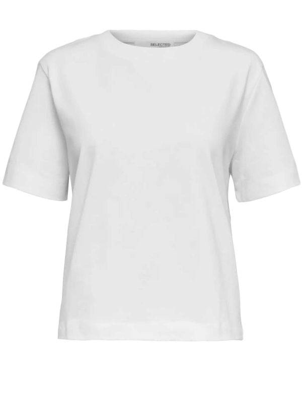 The Boxy Short-Sleeve T-Shirt by Selected is cut in a relaxed, boxy silhouette with a clean crew neckline and short sleeves. The straight hem falls to the hip, offering an easy, unfussy shape that tucks neatly into high-rise trousers or sits well over denim. Minimal seaming and a slightly structured sleeve make it a dependable layer for seasonal wardrobes. This tee works equally well under blazers or alone for pared-back weekend looks. Pair with tailored trousers or casual denim depending on the mood.