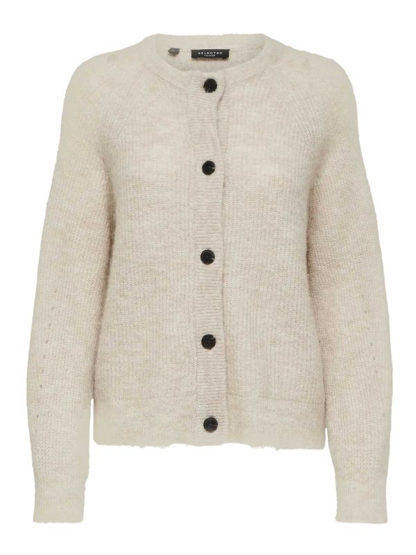 The Selected Lulu Short Knit Cardigan is a softly brushed button-through knit designed for easy layering. It features a round neckline, ribbed placket and long raglan sleeves that fall into a relaxed, short silhouette. Dark buttons provide contrast while the open-knit texture adds subtle depth and a gently fuzzy finish. Wear it open over tees and shirts or fastened for a neater look; the cropped length sits neatly at the waist for pairing with high-rise denim or tailored trousers. The piece balances comfort with clean detailing.