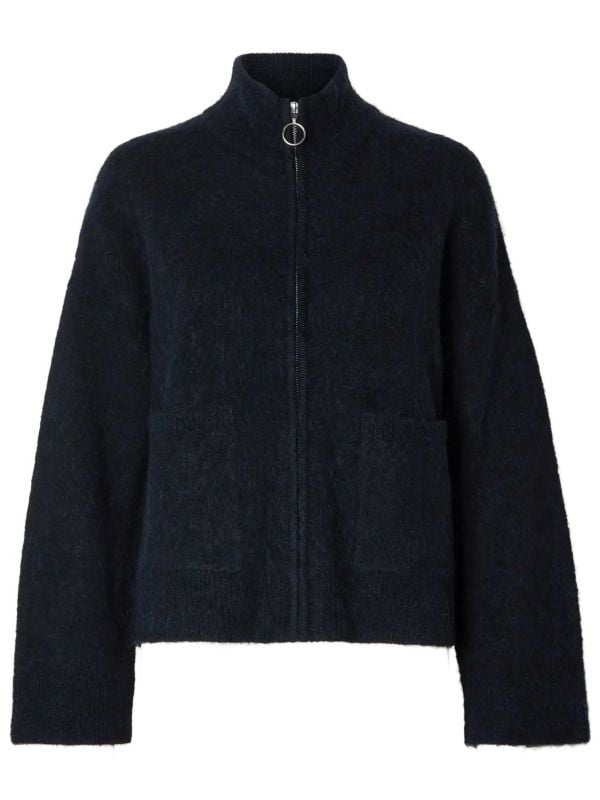The Sia Ring Zip Cardigan by Selected is a softly textured knit designed with a neat stand collar and a full-length metal zip finished with a circular ring pull. The boxy, slightly cropped silhouette features dropped shoulders and two front patch pockets for practical layering. Ribbed trims anchor the hem and cuffs, while the fuzzy surface gives a cosy handle. Wear zipped up for a streamlined look or open over tees and shirts for casual layering. The aesthetic is understated and functional, offering easy-to-wear warmth for cooler days.
