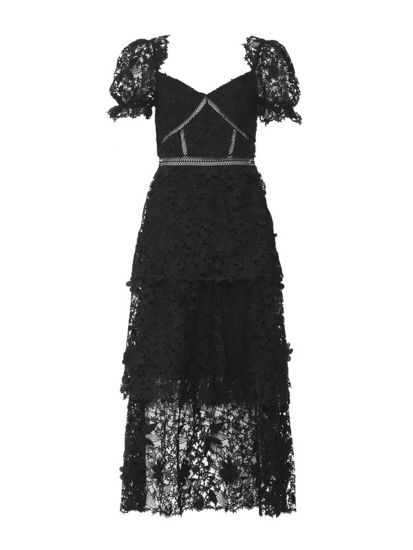 Elevate your formal wear this season with the Self-Portrait 3D flower lace tiered dress. Expertly cut from 3D floral lace, this elegant midi dress boasts a fit and flare silhouette with a sweetheart neckline and tonal grosgrain waistband. It falls to a tiered midi skirt and is complete with puff sleeves and a lined interior.
