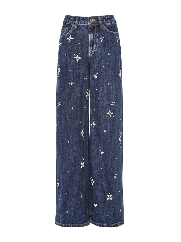 Discover disco denim! The Blue Embellished Wide Leg Jeans by Self-Portrait are sure to elevate any outfit. Cut from 100% cotton with a high-rise waist and wide legs, these Self-Portrait jeans are a standout pair adorned all over with colourful crystal flowers, offering a boho look for your everyday wardrobe.