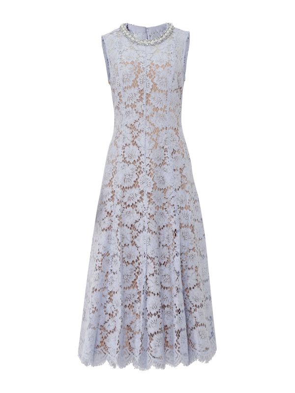 Discover another timeless style from Self-Portrait, the Blue Fine Lace Pearl Midi Dress. Crafted from fine lace, this Self-Portrait midi dress has a feminine, romantic look that's perfect for special occasions. A fitted style with a knee-length lining, it features a diamanté and pearl-embellished neckline and a flared hem. Simply pair with earrings and your favourite clutch.
