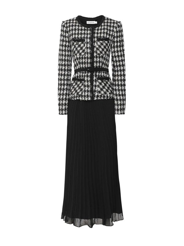 The Self-Portrait bouclé chiffon midi dress is an ageless piece that you'll come back to time and time again. Appearing as an individual jacket and skirt, this dress features a tailored suit-inspired top with a narrow black belt and a pleated midi skirt, creating a delightfully feminine hourglass silhouette. The black and white bouclé fabric has a touch of sparkle running throughout and is complete with black embellished snap buttons.