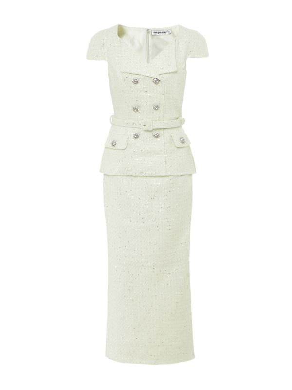Self-Portrait's Bouclé Peplum Midi Dress offers a tailored, two-piece-inspired silhouette in bouclé fabric with subtle sequin embellishment. It features a V-shaped neckline, cap sleeves and a double-breasted front fastened with diamanté buttons. A covered belt defines the waist above flap pockets and a peplum hem, while the pencil skirt falls to mid-calf with a Center-back vent and concealed Zipper closure. Layer beneath a tailored coat or pair with minimalist accessories for polished occasion dressing.