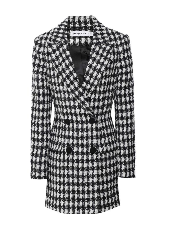 The Self-Portrait bouclé tailored mini dress is designed for instant sophistication. It features a double breasted, tailored blazer-style design with a luxurious black and white checked pattern in a bouclé fabric with a hint of black and gold sparkle. The cinched waist accentuates the body and creates an hourglass silhouette. Style it with statement heels.