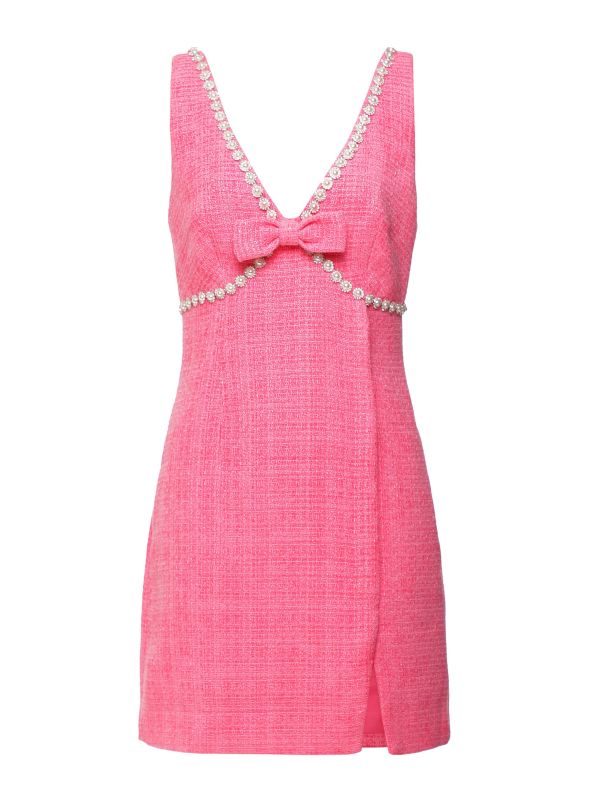 Get a chic look this season with the Self-Portrait boucle mini dress. Cut from structured pink bouclé, this showstopping mini boasts a tailored silhouette, a flattering V-neckline and beautiful diamanté trims. The dress is complete with a bow detail to the front and a split hem skirt for a leg-lengthening look.