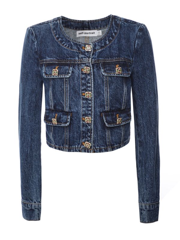 The Self-Portrait Buttoned Denim Jacket offers a stunning update to the classic denim jacket. Crafted from 100% cotton and cut to a cropped length, the jacket is complete with a round neckline, shoulder pads, long sleeves, concealed press-stud fastenings, rich-coloured embellished buttons, contrast stitching and four flap pockets to the front. Style it with jeans or a denim skirt for a stylish double-denim look.