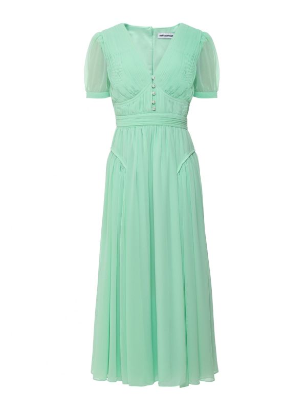 Add bursts of femininity and elegance to your evening collection with the Self-Portrait Chiffon dress. Beautifully crafted from luxurious materials, the dress is fitted to the waist and flared at the midi skirt. With a super flattering v neckline and gathers throughout the bodice, the Self-Portrait dress is complete with stunning pearl buttons to the center front. Style yours with heels for the perfect evening look.