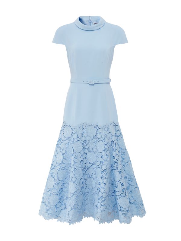 Self-Portrait's Crepe Lace Midi Dress is a sculptural midi that pairs a smooth crepe bodice with a full floral lace skirt. The design features a high roll neckline, cap sleeves and a thin belted waist that defines the silhouette. A back Zipper provides a neat finish while the skirt falls to a scalloped midi hem. The lace overlay is layered over a lined skirt for coverage. Ideal for formal events and special occasions, this dress balances architectural shaping with detailed lacework.