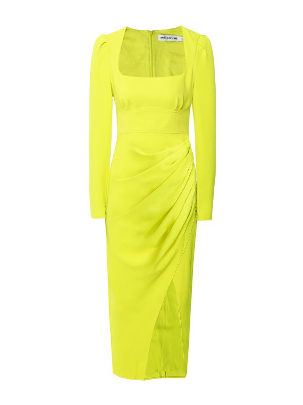 The Self Portrait ruched midi dress is the perfect option for your next evening occasion. Beautifully tailored with a fitted bodice and ruched skirt for a flattering hourglass silhouette, the dress has been crafted in a heavy crepe offering a silky, fluid texture. Featuring a square neckline with subtle puff sleeves and elegant leg split, with the lively lime hue providing statement impact.